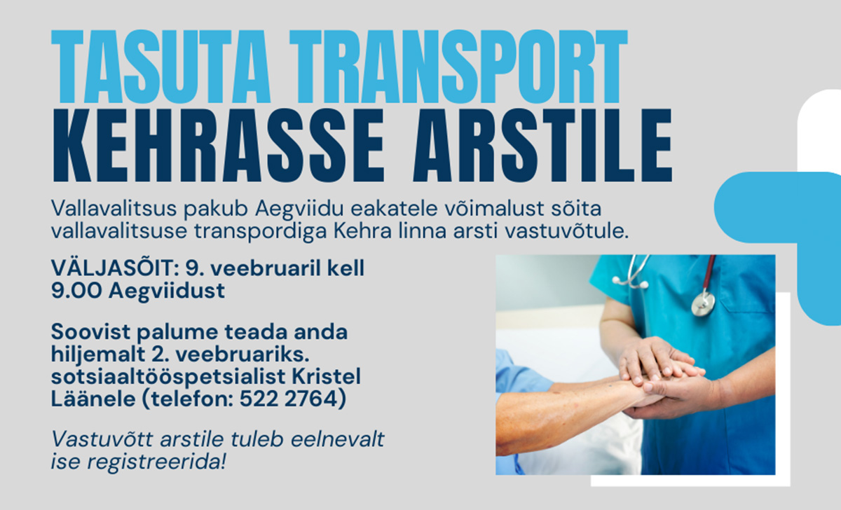 Anija vallavalitsus pakub Aegviidu piirkonna inimestele üks kord kuus transporti Kehrasse arsti juurde. See on mõeldud eakatele ja teistele, kellel pole võimalust arsti vastuvõtule minna. Esimesel korral, 19. jaanuaril kasutas võimalust üks inimene, tema viis autoga Kehrasse ja tagasi valla sotsiaaltöötaja. Sõidud toimuvad kolme nädala tagant esmaspäeviti. Järgmine väljasõit vallavalitsuse hoone juurest Kase tänaval on 9. veebruaril, transpordi soovist tuleb Aegviidu piirkonna sotsiaaltööspetsialistile teada anda nädal varem.