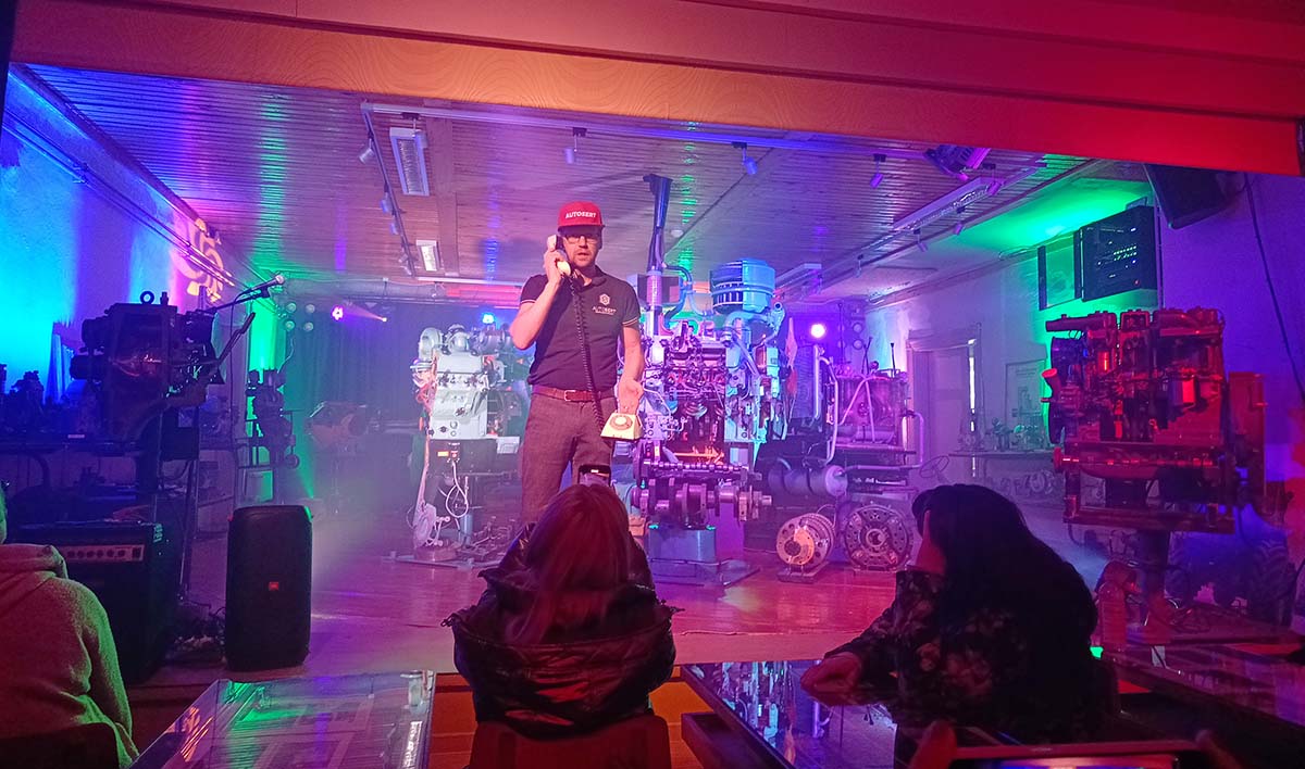 Kutsekooli õpilaste jaoks tehtud pöörlevatel pinkidel istuvad külalised lähevad Lenno Põdra sütitava jutu ja värvimuusika saatel otsekui ajarännakule. Näeb kooli tollase juhi Helmut Vajaka leiutatud ja ehitatud pöördlava traktorimootoritega, seinast väljatulevat telerit, elektriliselt avanevaid eesriided ja sahtleid, projektoreid ja õppejooniseid. Perfomansi jooksul jõuab mitmel korral ja eri rollides lavale, mürisevate mootorite vahele, ka Arto Saar.