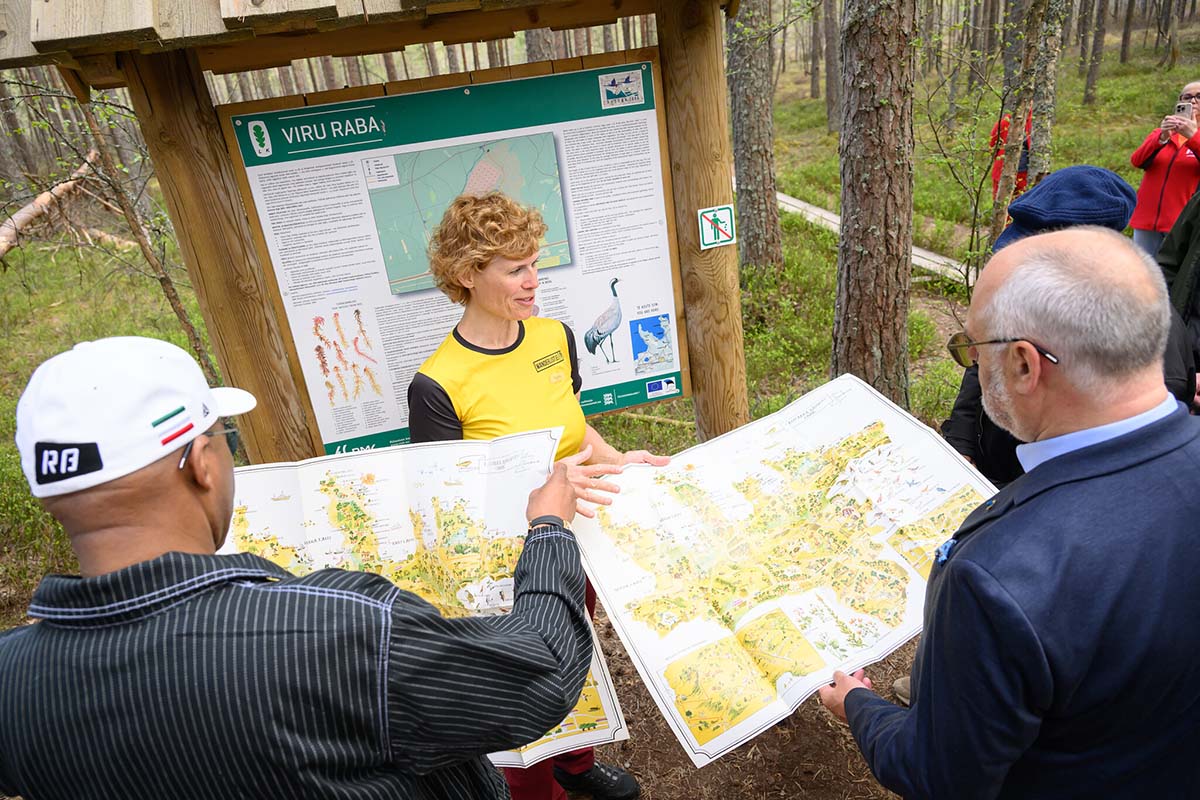 Viru raba suures parklas võttis külalised vastu Wanderlust Matkad OÜ üks asutaja ja matkajuht Signe Ohakas oma tiimiga. Koos suure saatjaskonnaga kõnniti mööda laudteed vaatetornini, kus külalistele esinesid Kuusalu valla Kasispea küla juurtega laulja Kadri Voorand ja Mihkel Mälgand.