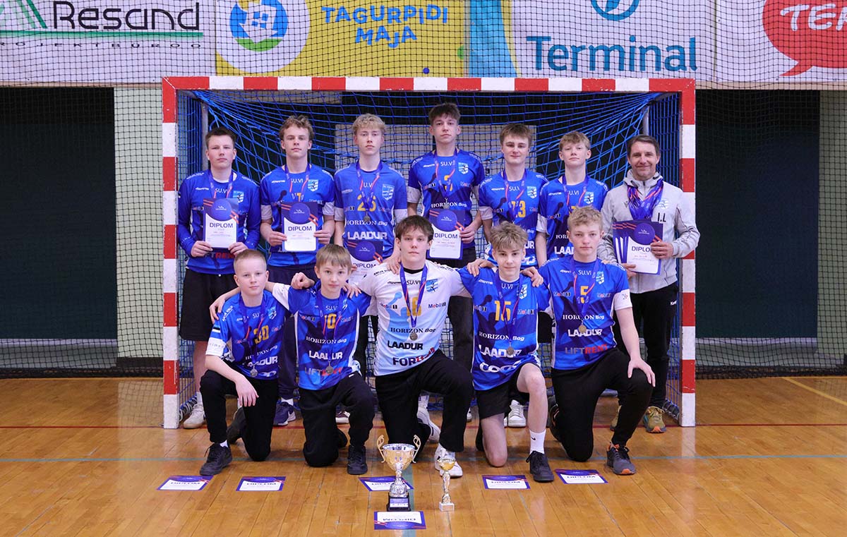 Ees­ti meist­ri­võist­lus­tel hõ­be­me­da­li võit­nud HC Keh­ra mees­kond koos tree­ner IND­REK LILL­SOO­GA. Fo­to Mer­lin Raud­kett/Ees­ti Kä­si­pal­li­liit