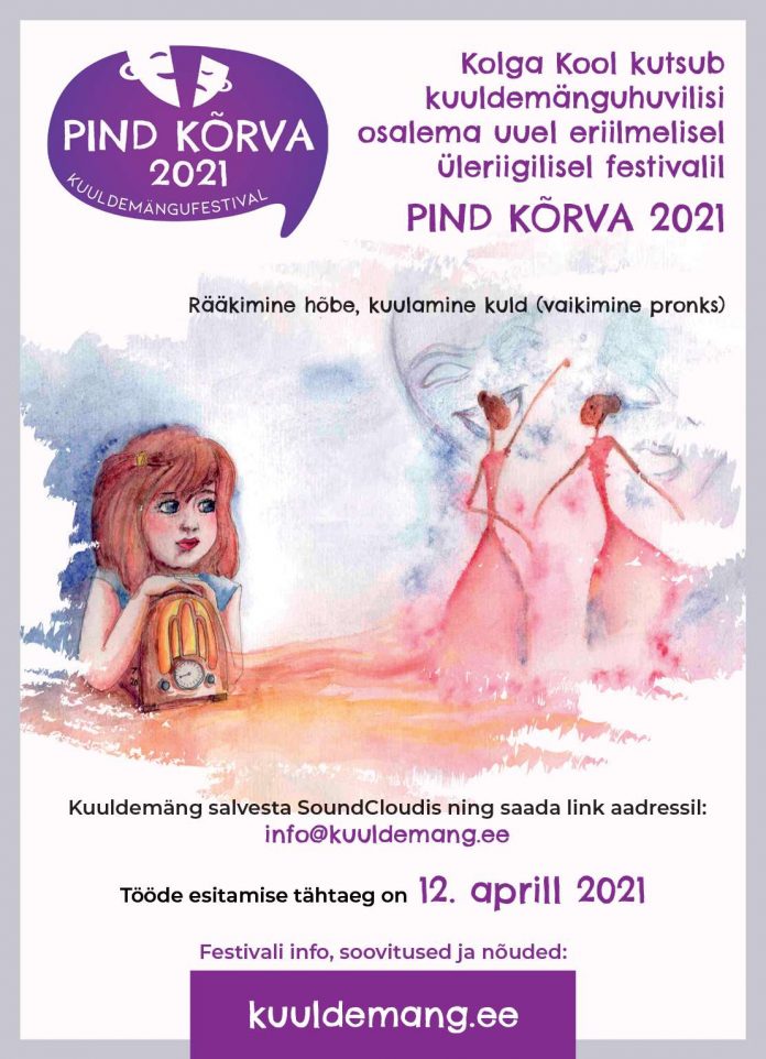 Kolga kooli esmakordselt korraldatava kuuldemängufestivali Pind Kõrva 2021 žüriisse kuuluvad Raadioteatri peatoimetaja Tiina Vilu, lavastaja ja näitleja Andres Noormets, näitleja Tambet Tuisk ning raadiosaatejuht ja Eesti Pimedate Liidu juht Jakob Rosin. Festivali veebilehel kuuldemang.ee on videolõik, kus Tambet Tuisk jagab kuuldemängu tegemiseks soovitusi. Festivali peakorraldaja, Kolga kooli huvijuht Liina Talts ütles, et kõik žüriiliikmed olid kohe nõus osalema, kui said kutse. Festivali vastu tuntakse tema sõnul huvi, uuritud on selle kohta mitmelt poolt üle Eesti. Tööde esitamise tähtaeg on 12. aprill. Kolgas korraldatakse ka oma koolisisene kuuldemängude konkurss.