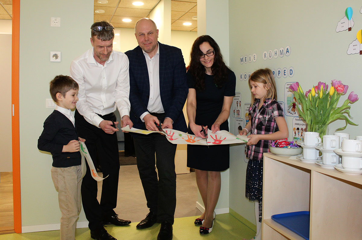 Piduliku aktuse järel lõikasid vallavanem Raul Siem, koolidirektor Triin Hallik ja ehitusfirma juht Toomas Müürisepp uue rühma uksel läbi sümboolse lindi.